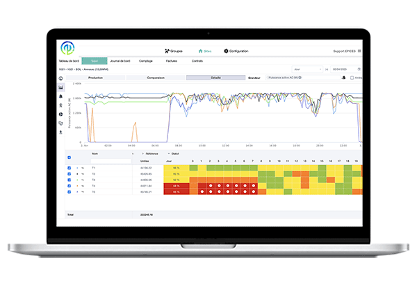 Le logiciel Épices possède différents graphiques et écrans, qui permettent à tout utilisateur d’afficher les données souhaitées, d'un parc de production hydroélectrique complet, ou des diverses turbines d’un parc. De cette manière, nos clients peuvent comparer les machines en toute autonomie, selon les préférences et les habitudes de suivi.