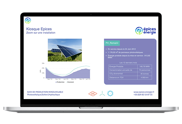 Grâce à la fonctionnalité du "Kiosque", la solution Épices permet aux professionnels du secteur de communiquer en temps réel sur leur production photovoltaïque. L'outil génère automatiquement un diaporama de votre production PV, qui peut être paramétré avec vos couleurs et selon vos besoins.